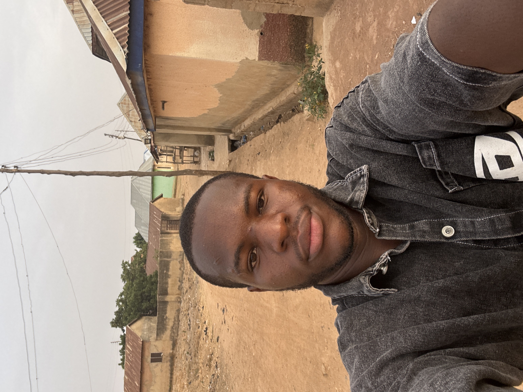 A man is facing forward in a vertical medium outdoor shot, possibly taking a selfie in a street in Rafin Par, Nigeria. The background features a dirt road, buildings with rusted corrugated metal roofs, and weathered walls. Power lines run along a utility pole. The man is wearing a dark button-down denim shirt with some visible white lettering or design on one sleeve.