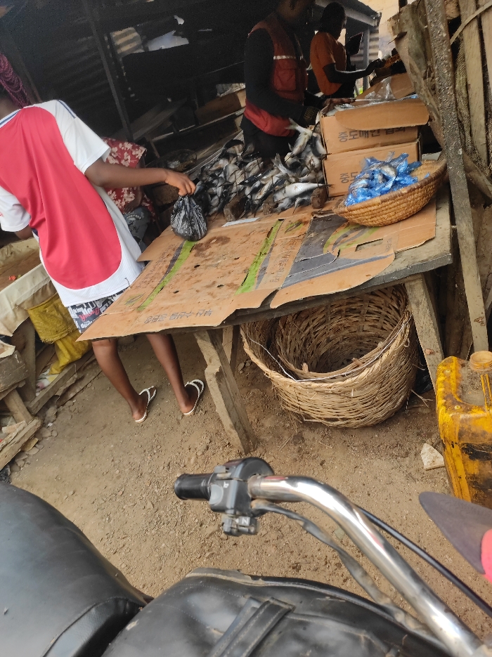 The image displays an informal outdoor market stall, viewed from the perspective of a motorcycle's handlebars, which are visible in the lower foreground. The location is an unspecified, rustic market area within an unknown city. The central feature is a wooden market stall with a corrugated cardboard top, which bears Korean text. On this surface, a large quantity of whole, silver-grey fish is arranged, some positioned on a metal grate. Adjacent to the fish, a small woven basket holds several individual portions of fish sealed in blue plastic bags. Behind the fish display, several stacked brown cardboard boxes are visible, also featuring Korean text. Three individuals are present. On the left, partially facing away from the viewer, a person wearing a red and white short-sleeved top and patterned shorts stands beside the stall. This individual holds a black plastic bag over the display. Their bare legs and white flip-flops are visible on the dry, dirt ground. Behind the stall, a person wearing an orange reflective vest over a dark shirt is positioned near the fish. Further right and partially obscured, a third individual in an orange t-shirt is engaged in activity behind the stall. Beneath the stall, a large, empty woven basket rests directly on the dirt ground. To the right of the stall, a yellow plastic jerry can is visible. The background elements include corrugated metal sheets and wooden structures, indicating a makeshift, utilitarian market environment.