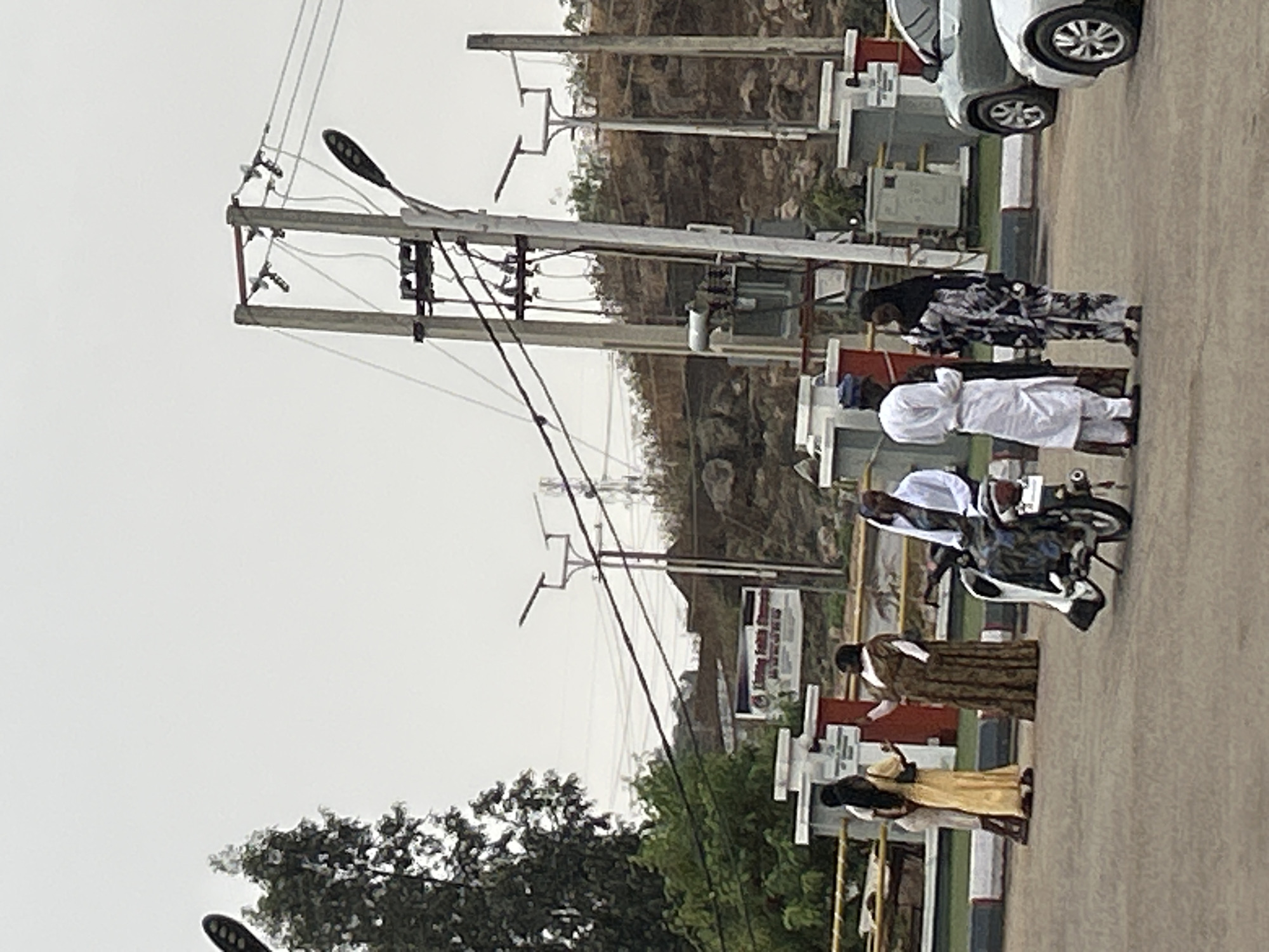The image depicts a street scene in Jos, Nigeria. Several people are visible, some wearing traditional clothing, standing along the side of a road. A motorcycle is parked nearby. Overhead, there are utility poles and power lines. In the background, a rocky hillside is visible. A white car is also parked on the street. The sky appears overcast.
