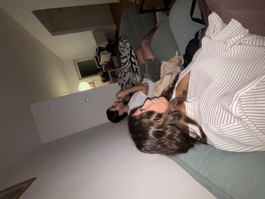 The image displays an indoor residential scene, likely a living room, in Unknown, Unknown, captured under dim lighting conditions. Two individuals, with a third partially visible, are seated on a light green modular sofa, facing towards the right side of the frame. In the foreground, an adult female with long, wavy dark hair is wearing a light-colored shirt with thin vertical stripes. She is seated with her profile visible, looking towards the right, with her lips slightly pursed. Behind her, to the right, an adult male with dark hair is also seated in profile, wearing a white short-sleeved shirt and dark green shorts. His right hand is near his mouth, and a small, multi-colored patterned bowl rests on his lap. A light-colored throw blanket is draped over the sofa between the two visible individuals. A third individual, largely obscured by the male, is visible only as a head/shoulder area covered by a black and white striped blanket. The room features white walls and a light-colored ceiling. A spherical white globe light fixture hangs from the ceiling in the mid-ground, providing ambient light. In the background, several doorways or openings lead to other parts of the residence. An area to the far right contains what appears to be stacked items or laundry. A framed object is partially visible on the upper left wall.