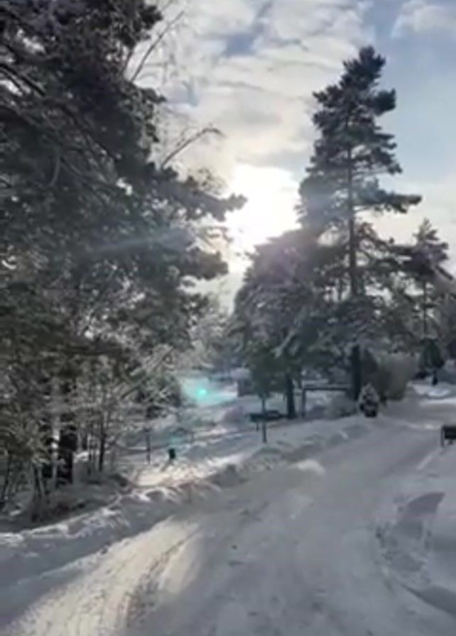 snow-covered path or road winding through a wooded area under a sky with scattered clouds. The sun is visible through the trees, creating lens flare effects. There is a person walking in the distance on the right side of the path. The trees are covered in snow, and the ground is completely white. Tire tracks are visible on the path, indicating recent vehicle passage. The general atmosphere is bright and wintery.
