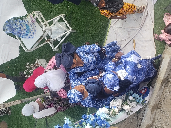 This high-angle image depicts an outdoor social gathering in Ajaokuta, Nigeria. The ground surface consists of green artificial turf and sections of white tarpaulin. A central cluster of four adult females is prominent, dressed in matching blue and white tie-dye patterned garments and head wraps, engaged in close conversation. One of these individuals holds a mobile phone. To the upper left, three other adult females are partially visible, two wearing white head wraps and patterned dresses (one floral, one pink), and another in a solid red dress. A young child, dressed in a yellow and brown patterned outfit with a dark head covering, stands isolated on the white tarpaulin to the right. A partial view of an individual in pink patterned attire is visible at the bottom edge. On the right, a white, multi-tiered metal stand supports a wrapped blue and white decorated item, possibly a gift or cake, accompanied by two small decorative bottles. In the lower left quadrant, a white structure is adorned with blue and white artificial flowers. A metal pole, likely part of a canopy structure (partially visible white fabric at the top), extends near the center-left. A concrete ledge forms the immediate foreground.