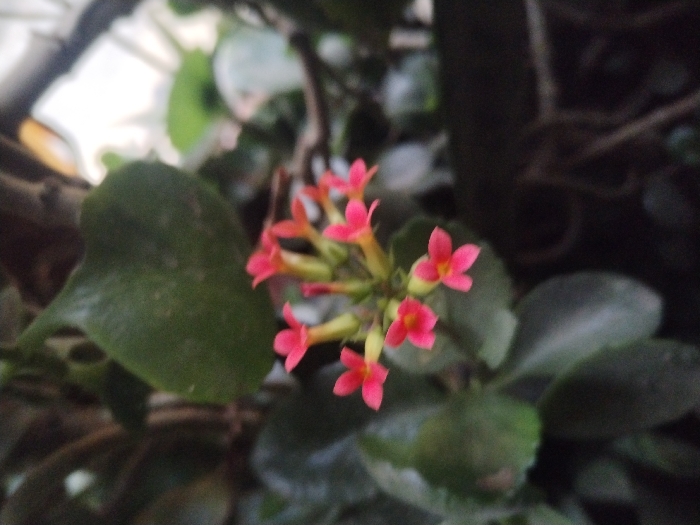 A cluster of small, vibrant pink Kalanchoe flowers with yellow centers are in focus. The flowers are surrounded by thick, dark green, succulent-like leaves. The background shows out-of-focus greenery and a hint of light, suggesting an indoor setting. The overall composition is a close-up, highlighting the delicate beauty of the flowers against the backdrop of foliage.