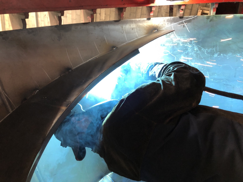 An industrial scene, located in Zaljevo, Montenegro, depicts a single individual engaged in welding
