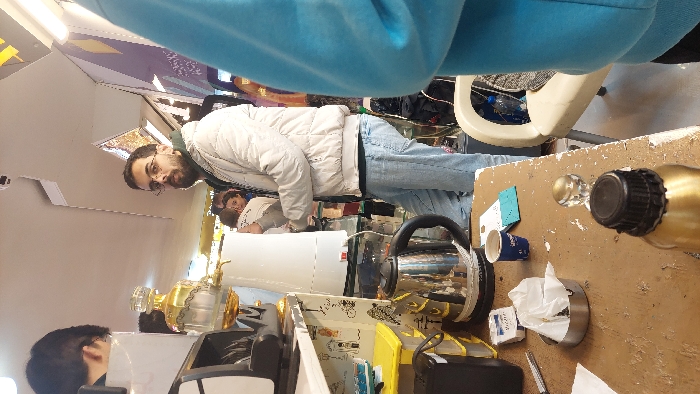A man wearing a white jacket and jeans stands near a table covered in various items. A shiny teapot, a decorative gold container, a small cup, and a bottle of champagne are visible on the table. Another person is seated nearby. An individual wearing a blue sweatshirt is visible from the upper portion of the frame. A white chair with a mesh seat is in the background.