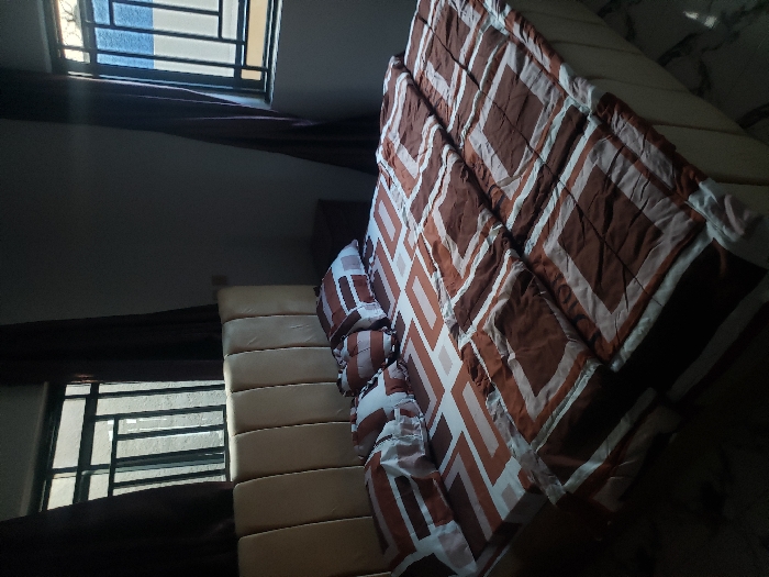 This is an interior forensic image depicting a bedroom located in Sabon Tasha, Nigeria. The central subject is a large bed with a cream-colored, vertically paneled upholstered headboard. The bed is fitted with a sheet featuring a geometric pattern composed of brown, dark brown, and white rectangular shapes. Multiple pillows with matching pillowcases are arranged at the head of the bed. A duvet or comforter, also displaying the same geometric pattern, is partially folded back over the foot of the bed. Two windows are visible. One is positioned behind the headboard, and another is to the right of the bed. Both windows are secured with dark-colored metal security bars or grilles and are partially covered by dark brown curtains. Natural light is entering through these windows. A dark brown wooden nightstand is partially visible to the right of the bed. The walls are light-colored. No individuals or active interactions are present in the scene.