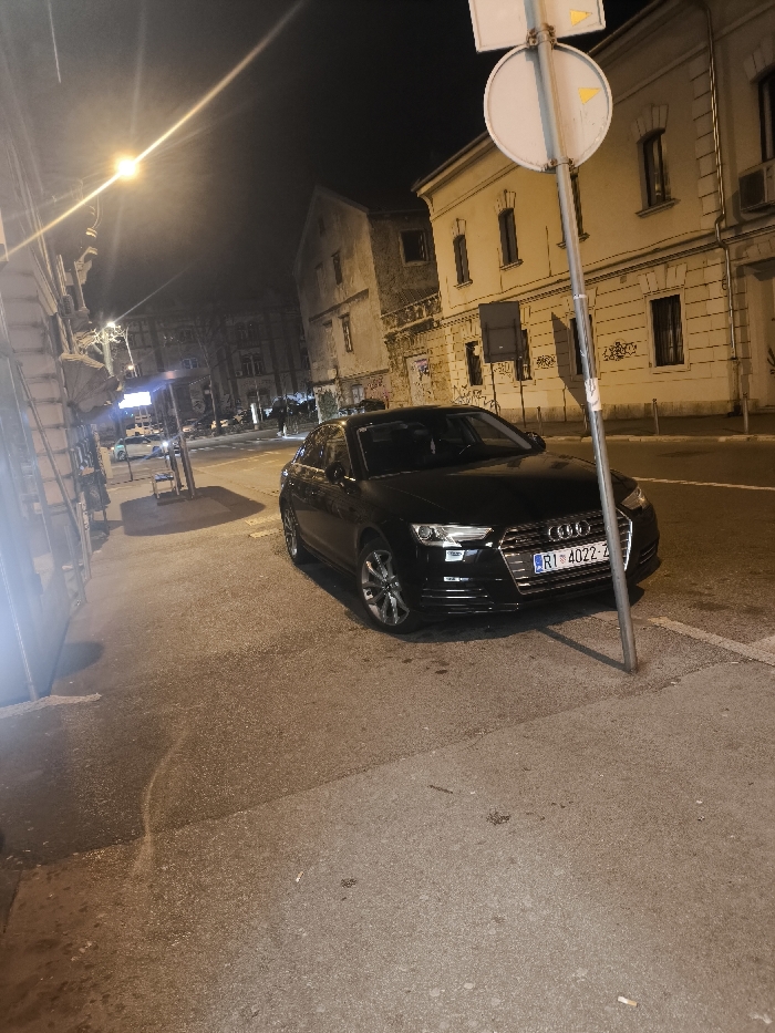 The scene depicts a nighttime urban street in Grad Rijeka, Croatia. A black Audi sedan, bearing Croatian license plate "RI 4022-Z", is parked at an angle, with its front right quarter resting on the asphalt sidewalk and the remainder on a narrow strip of dark asphalt adjacent to the main road. A metal sign pole stands directly in front of the vehicle's grille. To the right of the parked Audi is a light-colored, multi-story building with multiple windows, some featuring decorative lintels; graffiti is visible on its lower exterior wall. Further back and to the left, another older, darker building with a distinct roofline and apparent structural wear is visible. The foreground sidewalk is paved with dark asphalt, showing minor scattered debris. On the left side of the image, a bright street lamp illuminates the scene, creating a glare, and a bus stop or similar public shelter is visible further down the sidewalk. No individuals are clearly visible in the immediate foreground. Several other vehicles are discernible in the distance on the road, partially obscured by the darkness and street lighting. The overall environment is one of an older city street after dark.