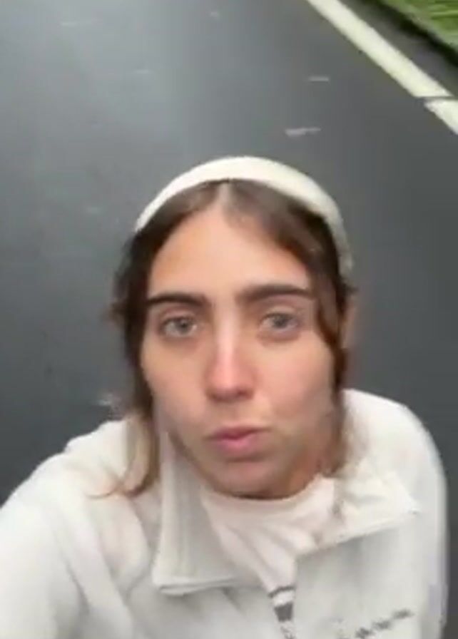A woman with blue eyes and brown hair is taking a selfie video while standing on a paved road