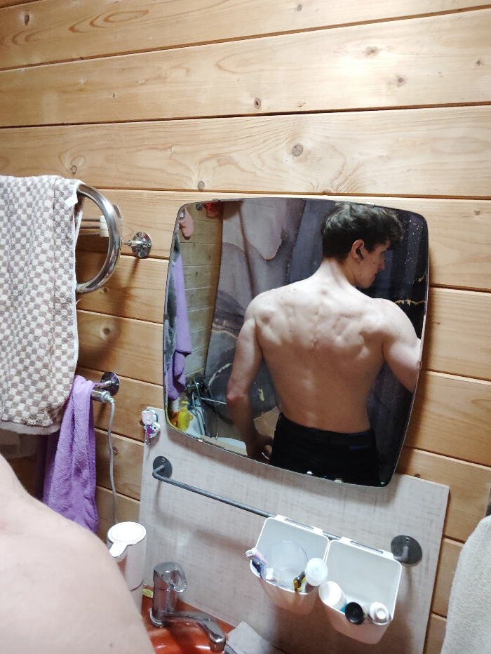 A bathroom with wooden walls and a mirror reflecting a muscular man from the back. He wears dark shorts and earbuds. Below the mirror, there's a sink with an orange basin, a towel rack, and a double container holding toiletries. A checkered towel and a purple towel hang on a metal bar to the left. Part of another person's body is visible in the foreground.