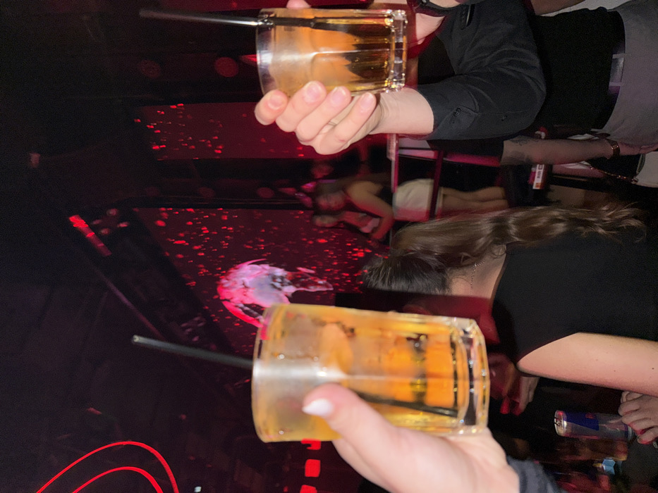 The image depicts an indoor scene within a darkly lit establishment, identified as a nightclub or bar in Tirana, Albania. The primary focus is on two individuals' hands in the foreground, each holding a clear, faceted glass containing an amber-colored liquid with ice cubes and a black straw. The glass on the left is held by a hand with manicured fingernails painted white. The glass on the right is held by a hand belonging to an individual wearing a black long-sleeved shirt. In the mid-ground, below the left glass, the back of a female's head and shoulders are visible. She has long, dark brown hair styled in a high ponytail and is wearing a black sleeveless top. A thin silver necklace is discernable on her neck. To her left, a silver Red Bull can rests on a surface. Below the right glass, part of a male's torso is visible, clad in a black short-sleeved shirt over a darker garment, paired with light-colored trousers and a black belt. A watch is present on his left wrist. The background is characterized by dim red illumination. A large screen displays abstract red patterns, including what appears to be a circular or spherical object with emanating splashes or particles. Several blurry figures, predominantly female, are scattered in the background, some appearing to stand near a raised platform or bar. Red linear lighting elements are visible on the ceiling. The overall environment suggests a social gathering at night.