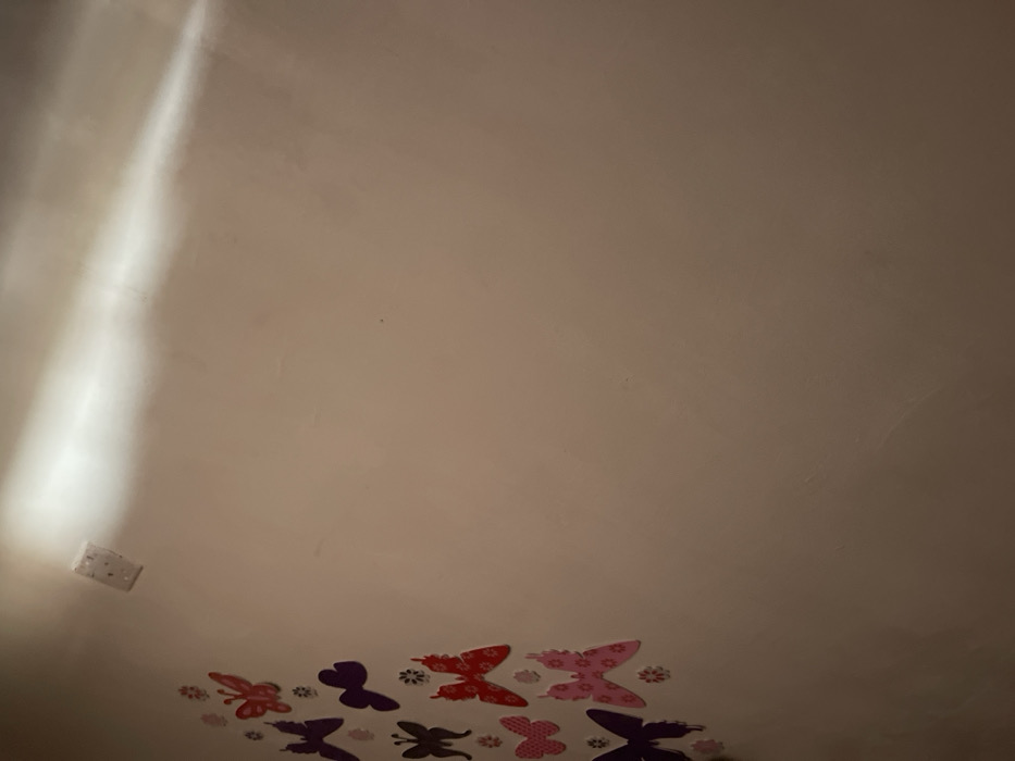 This image displays an interior wall in Tamaha, Nigeria. The wall is light-toned, possibly beige or off-white, exhibiting minor surface variations. A distinct horizontal band of bright light extends across the upper right section, indicating an overhead light source. In the upper-left quadrant, a white electrical wall plate is affixed. The left side of the wall is decorated with a vertical arrangement of adhesive butterfly cutouts in various sizes and colors, including red, purple, dark brown, and pink. Smaller, patterned floral cutouts are interspersed among the butterflies. No human subjects or active events are depicted.
