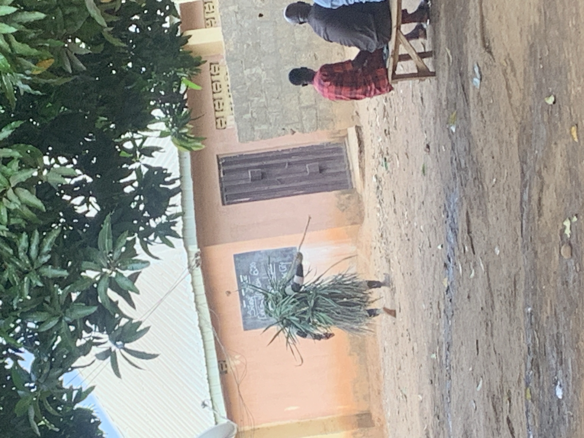 The image depicts a scene outside a building in an area with sandy soil. To the left is a tree with dense foliage. Adjacent to the tree is a building with a corrugated metal roof and peach-colored walls. A chalkboard with writing on it is mounted on the wall. A person covered in long, green plant material stands in front of the chalkboard, holding a thin, light-colored stick. Further to the right, two individuals are seated on a wooden chair. The first is wearing a gray shirt and the second a red plaid shirt. A door is visible in the building's wall behind them. The setting appears to be a village or rural area.