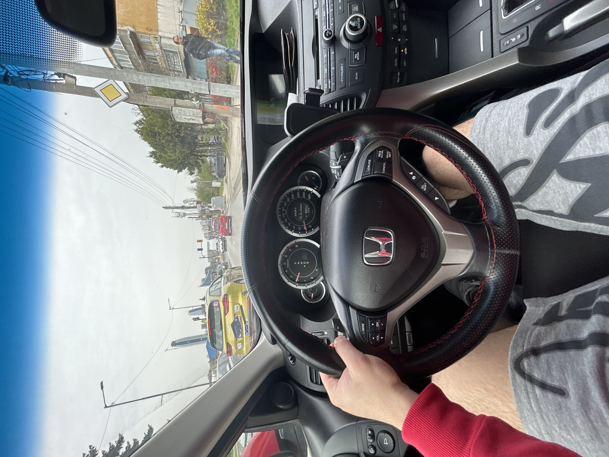 Here is a detailed description of the image: **Setting:** The photo appears to be taken from inside a car, looking out the front windshield while driving in a city. Based on the presence of Cyrillic characters on the car's display screen, distinctive building architecture and traffic signs, this location is consistent with the city of Sofia, Bulgaria. **Objects:** - The main focus is the interior of the car, including the steering wheel (with a Honda logo), dashboard instruments, and the central console. - Outside, there are other cars, buildings, a pedestrian, traffic lights, and road signs visible. A yellow rhombus-shaped sign is prominently displayed on a utility pole near the sidewalk. - Visible buildings include apartment buildings and possibly some high-rise structures in the distance. - A yellow Kia vehicle is directly in front of the car taking the photo. **People:** - There is a person visible in the driver's seat, with their hands on the steering wheel. The person is wearing a red long-sleeved shirt and gray shorts. - A pedestrian is visible on the sidewalk outside. The pedestrian appears to be an adult male. **Actions and Interactions:** - The car is presumably in motion, driving on a city street with moderate traffic. - The driver has their hands on the steering wheel, indicating they are actively driving. **Environment:** - The weather appears to be overcast or hazy, with a somewhat muted light. - The street environment seems urban and residential, with a mix of apartment buildings and some green spaces along the road. **Specific Details Supporting Sofia, Bulgaria Location:** - The use of Cyrillic characters on the car's instrument display - The style of architecture visible in the surrounding buildings - The design of the street signs and traffic lights, including the presence of specific road signage, is consistent with Bulgarian road markings - The presence of Cyrillic license plates on nearby vehicles - Distant building style and architecture is consistent with Sofia, Bulgaria