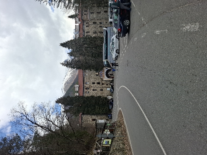 An exterior daytime view captures the Rila Monastery in Рилски манастир, Bulgaria. In the foreground, an asphalt road with a solid white dividing line on its left curves towards a parking area on the right, marked by faded white lines. A dark blue sedan is parked on the far right, its driver's side door open, with one individual wearing a light-colored jacket standing beside it. To its left, a white sedan and a large grey tour bus are parked. Two persons are visible near the front of the tour bus, moving towards the monastery's central arched entrance. Additional vehicles are parked along the road further left. The Rila Monastery itself is a prominent stone structure with multiple stories, a red tile roof, and crenellated sections, featuring numerous rectangular windows. Several tall, dark green coniferous trees stand in front of the monastery, partially obscuring its facade. A steep, tree-covered hillside with bare deciduous trees borders the road on the left, where a stone wall and a signpost are visible. Snow-capped mountains rise in the background beneath a sky that is partially blue with scattered clouds.