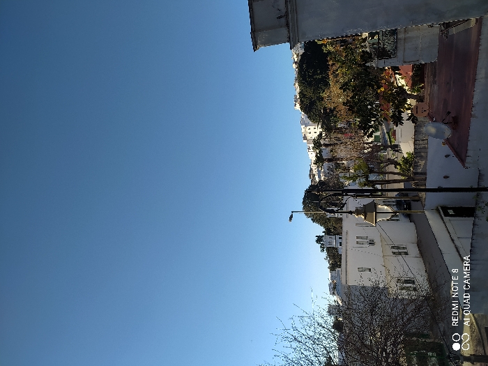 A view captures a city street nestled between white buildings. Sunlight dapples the trees lining the road. The sky is clear and blue. An antenna sits on a roof of one of the buildings. The camera's watermark is visible in the corner.