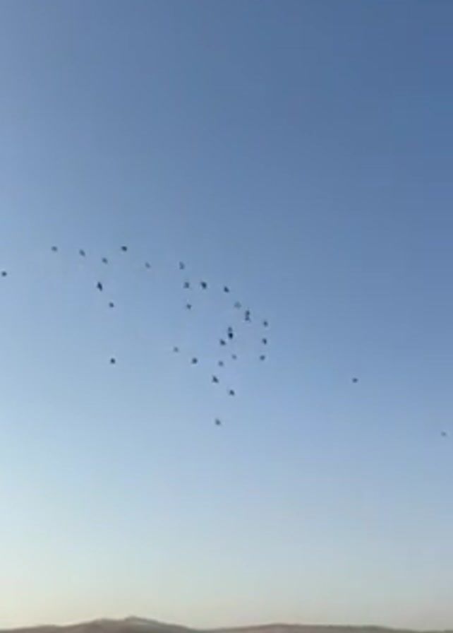 flock of birds flying in formation against a clear blue sky. Below, there's a view of a cityscape with buildings and in the distance, rolling hills or mountains. The buildings in the city appear to be mostly low-rise. The lighting suggests it could be morning or late afternoon.
