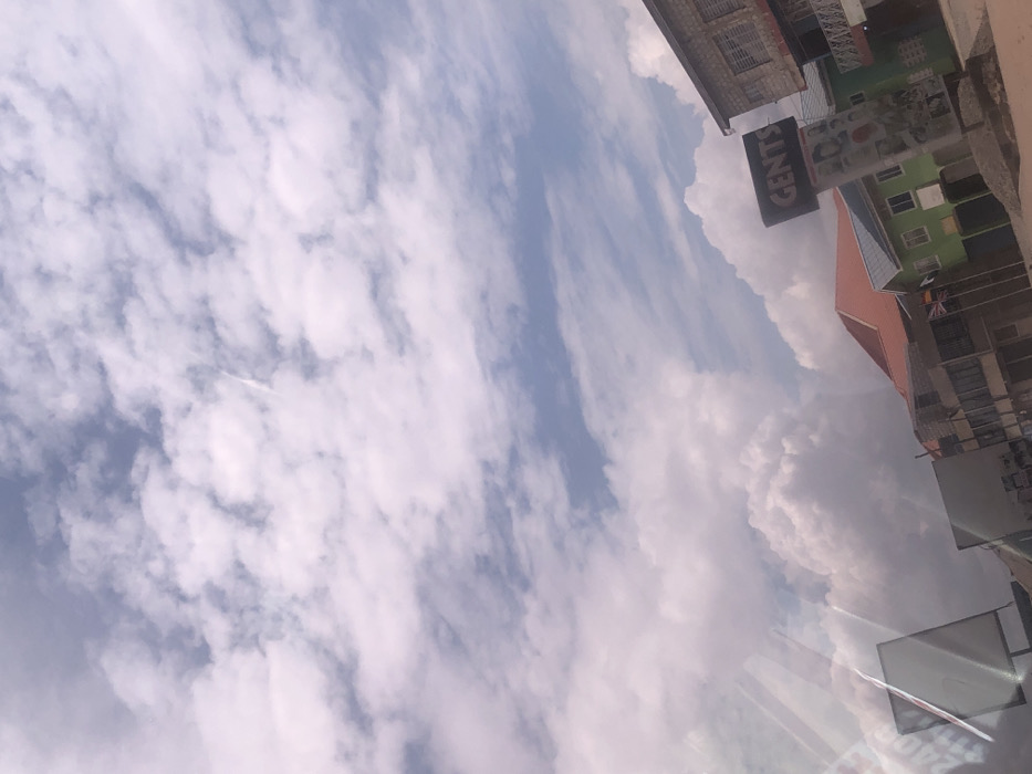 This image captures a street scene in Weija, Ghana, observed from behind a reflective surface, likely a vehicle window. The upper two-thirds of the frame is dominated by a bright blue sky with scattered white cumulus clouds and a faint, high-altitude contrail. The lower portion of the image features a line of multi-story buildings and structures. From left to right: 1. A building with a dark facade and a red sloped roof is partially visible on the far left. 2. Adjacent to it, another building with a light blue sloped roof and brown-toned upper floor is present. 3. In front of these buildings, three flagpoles are erected, one clearly displaying the Union Jack flag of the United Kingdom. 4. A prominent lime-green two-story building with a light blue roof stands centrally, featuring a dark entrance area. 5. Immediately in front of the green building, a tall, dark rectangular sign labeled "GENTS" in white capital letters is mounted on a pole. Below the "GENTS" text, the pole features a series of black and white photographic portraits. 6. To the far right, a partially constructed or unfinished building made of concrete blocks, with exposed horizontal window openings, frames the edge of the scene. The ground in the foreground appears unpaved, consistent with dirt or sand. Significant glare and reflections, including parts of a digital display showing "2400" and "2111," are visible in the lower left quadrant, indicating the image was captured through glass. No individuals are distinctly visible, beyond the portraits on the "GENTS" sign. The overall perspective is tilted, ascending from left to right.