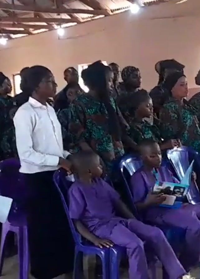 A room filled with people is captured in a medium shot. The room is simply decorated, featuring a light-colored floor and walls, with a corrugated metal roof supported by wooden beams. Natural light pours in through a window on the right side of the frame. Standing in the center of the room is a group of approximately 25 individuals, predominantly women, all wearing matching green patterned outfits. They appear to be singing or chanting. A woman in a white blouse and black skirt stands slightly in front of the group. In the foreground, two young boys dressed in purple outfits are seated on purple chairs. One of them is looking at a blue book. Next to them are several empty yellow chairs. Other people, dressed in various attires, are seated behind and to the sides of the central group. A bottle of water sits on the floor beside one of the yellow chairs. The camera remains static throughout the video.