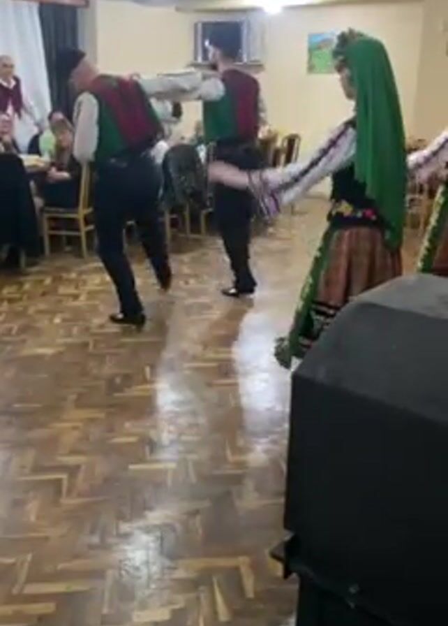 A video shows a group of people in traditional Bulgarian folk costumes performing a line dance in a well-lit indoor space with a wooden parquet floor