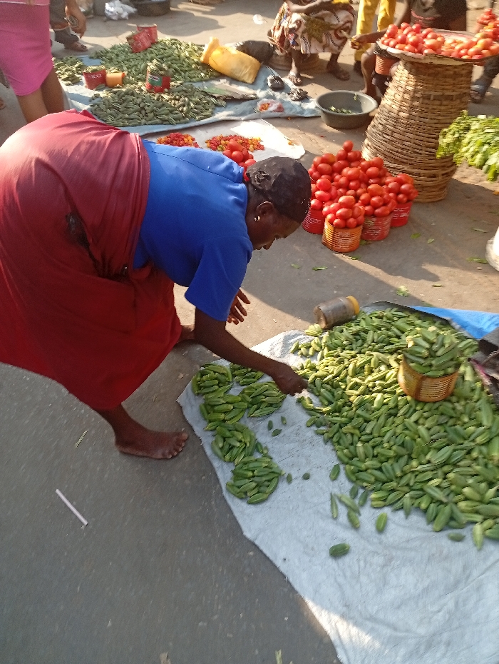 A woman in a red wrap and blue shirt is sorting green vegetables laid out on a white cloth on the ground. More vegetables are piled nearby. Tomatoes and other items are also for sale in the open market setting. The woman is barefoot and bent over her wares, carefully arranging the produce. Other vendors and customers are visible in the background.