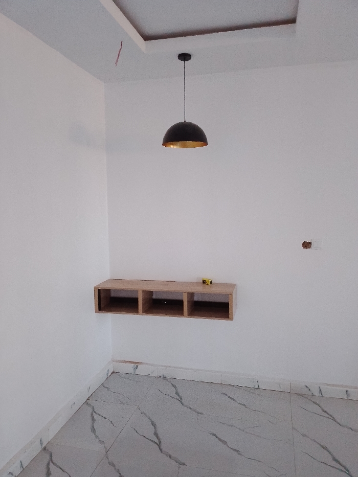 The image depicts an interior room in Bar Gada, Nigeria, characterized by white walls and a light-colored tiled floor with dark grey veining. A black, semi-spherical pendant light fixture with a gold interior hangs from the white ceiling. A rectangular recessed panel is visible on the ceiling in the upper left corner, with a single red electrical wire protruding. A light-brown, three-compartment floating shelf is mounted on the right wall, approximately midway up, with a small yellow object, possibly a level, resting on its far right end. To the right of the shelf, a white electrical outlet plate is positioned next to an irregular patch of exposed wall material. White baseboards line the walls at floor level. No individuals or active interactions are present.
