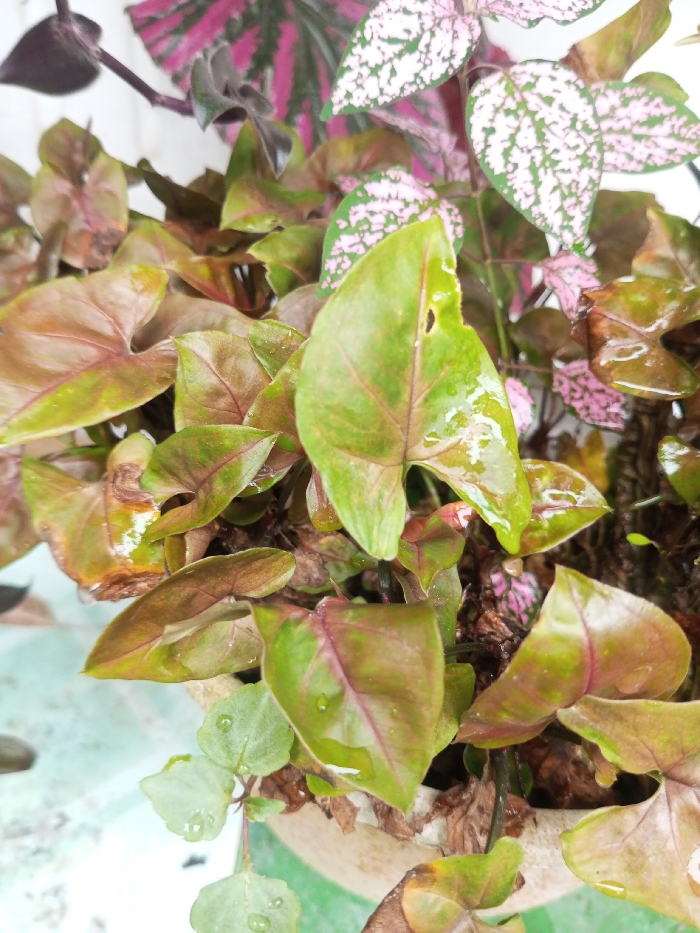 A close-up, high-angle view captures a collection of potted plants in Khammam, India. The foreground and midground are dominated by a plant featuring numerous green and reddish-brown, arrow-shaped leaves. Many of these leaves display visible water droplets on their surfaces. A prominent green leaf near the center exhibits a small, irregular tear or perforation. Interspersed and in the background, other plant species are visible, including one with dark green leaves heavily speckled with pink or white variegation, and another with dark pink and green striped foliage. A dark-colored stem or vine is also present in the upper left. The plants are situated in a light-colored pot, partially visible along the bottom and left, which features a green band or stripe. A pale, possibly wet or stained, textured surface is faintly discernible in the lower-left corner. No human figures are present.