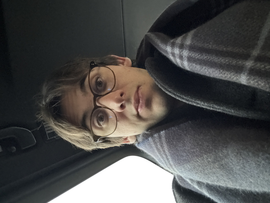 A male individual with brown hair and brown-framed eyeglasses is depicted in a close-up, upward-angled selfie taken inside a vehicle in Roissy-en-France, France. He has a light complexion, his eyes are wide, and his lips are slightly parted. He is wrapped in a grey and dark blue plaid-patterned blanket or scarf, visible around his neck and shoulders, over a dark garment. The vehicle's dark interior ceiling is visible in the upper portion of the image. A bright, featureless white light source, presumably an exterior sky, is visible through a window on the left side of the frame.