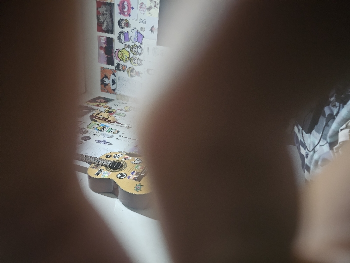 A sticker-covered guitar lies on a white surface, amid scattered stickers and papers. Anime-themed images adorn the wall behind, adding to the chaotic yet personalized atmosphere. The image is obscured by blurry foreground elements, possibly fingers, directing focus towards the central guitar and surrounding paraphernalia. A partial view of patterned fabric is visible on the right.