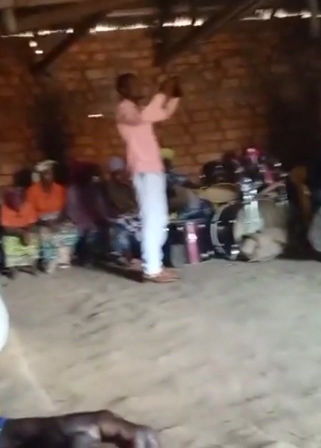 gathering of people in an indoor space with brick walls and a wooden ceiling. Most of the people are seated along the wall, while others are standing and facing towards the seated group. A man in a pink shirt is standing in the center of the room, holding a phone. Several men in suits are standing and talking to the group, pointing with their arms. A set of drums is visible. A person is sitting on a yellow chair in the foreground with a notebook and pen on a table in front of them. The lighting is dim, making it hard to see details clearly. The overall atmosphere seems informal, possibly a meeting or a religious gathering.