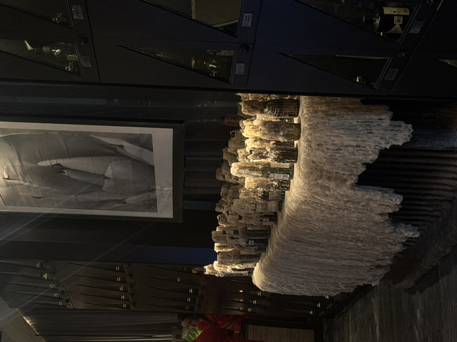 An indoor scene features a black wall with decorative triangular shelves holding objects. Below, a framed black and white image hangs above a row of wine bottles encased in what appears to be thick, textured, white material, resembling melted wax or a sculpted structure. The bottles are arranged in a grid-like fashion, partially obscured by the white substance. In the lower portion, hints of a person in a red garment and interior design elements are visible.