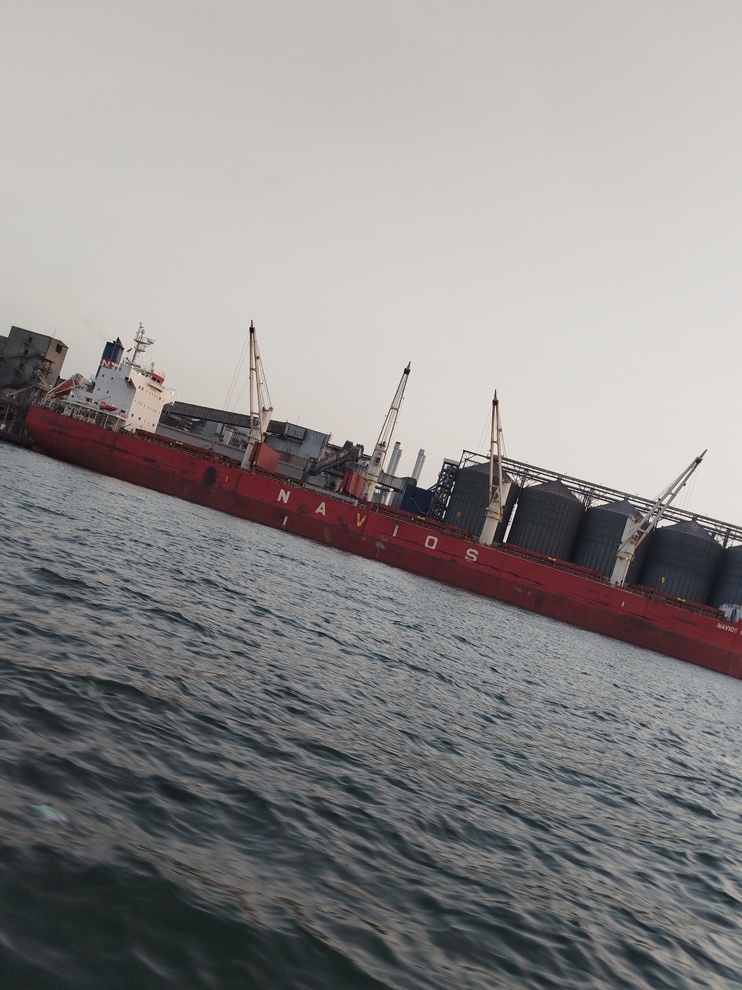 The image displays a red-hulled bulk carrier ship, identified by "NAVIOS" lettering on its side, docked at a commercial port facility in Lagos, Nigeria, consistent with Apapa Port. The vessel's white superstructure with blue accents and multiple white cargo handling cranes are visible on deck. On the adjacent pier, a series of large, grey cylindrical storage silos and extensive elevated conveyor belt systems indicate a bulk cargo handling terminal. Additional industrial buildings and several tall chimneys are visible behind the silos. The foreground features dark, rippled harbor water, with a small, light-colored unidentified object floating near the lower-left. The sky is uniformly light grey. No individuals are visible.