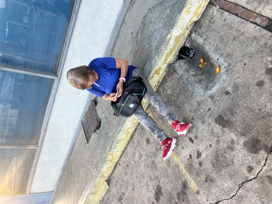 - "An overhead, slightly angled photograph captures an elderly female seated on a concrete curb in Valencia, Venezuela" by FM-8J5hb2, licensed under CC BY 4.0