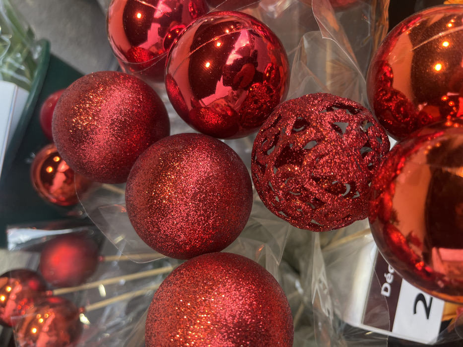 This image depicts a collection of red spherical ornaments, likely intended for festive decoration, displayed in a retail or market setting within the city of Aiguilhe, France