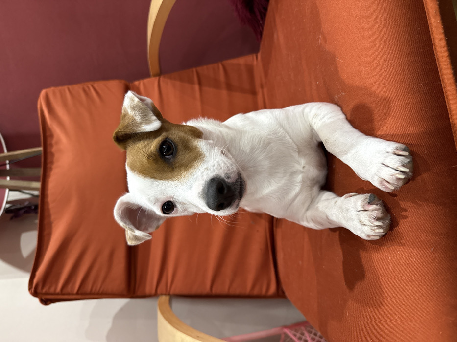 - "A young Jack Russell Terrier is positioned centrally on an orange fabric-upholstered armchair, looking directly forward" by FM-fASGr2, licensed under CC BY 4.0