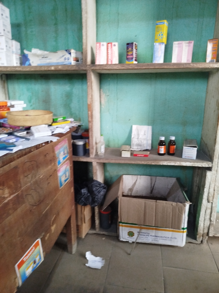 A cluttered wooden shelving unit contains various items, including medical supplies, boxes, and bottles. The shelves are painted a faded blue-green color, showing signs of wear and age. A wooden counter or table is situated to the left of the shelves, covered in papers and containers. The overall impression is one of a disorganized storage space, likely within a medical or pharmaceutical setting. A cardboard box sits on the floor beneath the lower shelf.