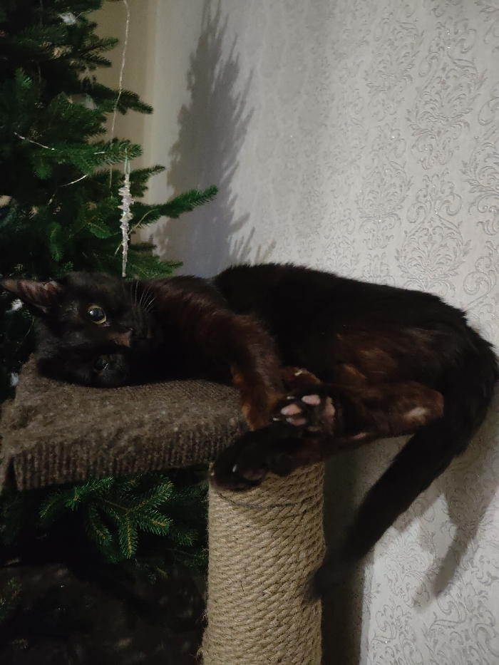 A black cat with amber eyes lies on a brown cat tree platform, its paws visible. The cat is positioned next to a Christmas tree. The background features patterned white wallpaper and shadows, likely from the tree. The rope-covered support of the cat tree is visible below the platform. The overall scene is dimly lit.