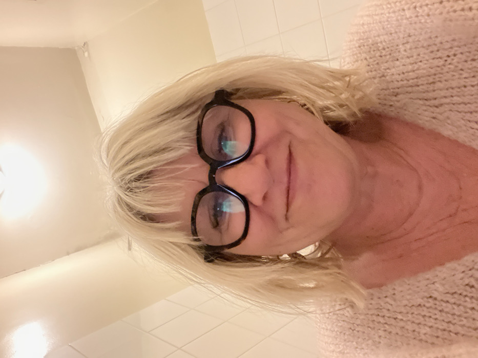 An upward-angled, close-up photograph depicts a single adult female in an indoor setting within La Fouillouse, France. The subject, positioned centrally, has shoulder-length blonde hair with bangs, styled in a somewhat disheveled manner. She wears dark-framed, octagonal or rounded-square eyeglasses, through which reflections of a light source are visible. Her expression is a slight, closed-mouth smile directed towards the camera. She is dressed in a light-colored, possibly beige or pale pink, chunky knit sweater, visible from the shoulders down to the upper chest. The immediate background features a light-colored ceiling with a central illuminated circular light fixture. The walls are also light-colored, with a section of white square tiles present on the right side of the frame, extending from the mid-right edge towards the ceiling.
