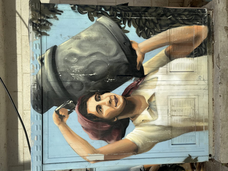 A mural on a metal garage door depicts a woman looking upward. She wears a red headscarf and white shirt. Above her, a large gray object resembling a bucket or container is tilted as if pouring something. One of her arms is raised, holding a dark, rectangular object to her ear, possibly a phone. The background consists of a light blue sky and dark green foliage, suggesting an outdoor scene. The metal door exhibits signs of wear and tear.