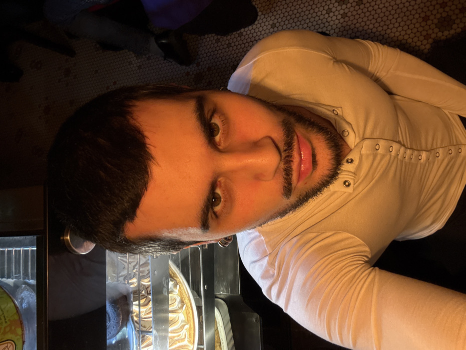 A man with dark hair, defined eyebrows, and a trimmed beard gazes directly at the camera. He wears a white shirt with snaps down the front. A display case filled with desserts is visible to his left. The flooring features small, round tiles. Another person's legs are visible in the background.