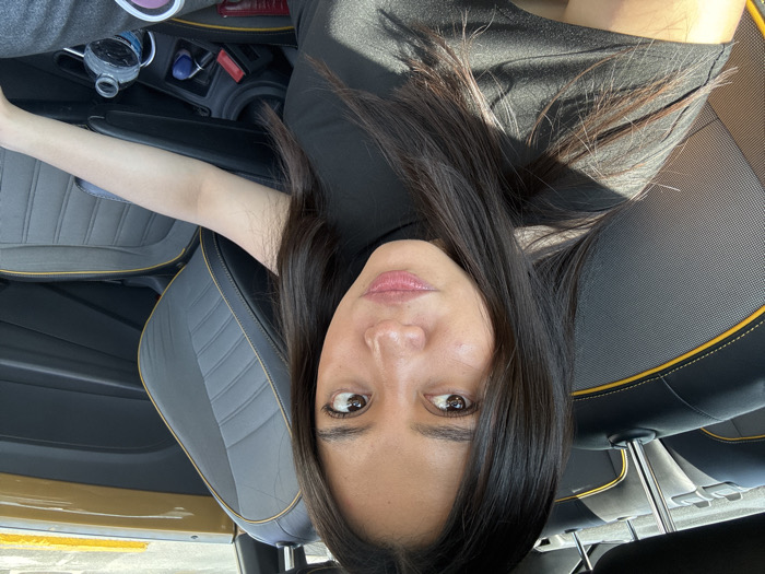 A woman with long, dark hair and fair skin poses inside a car. She is wearing a black top. Her gaze is directed upwards towards the camera, capturing her eyes and facial features. The car's interior is visible, featuring dark grey seats with yellow stitching. A water bottle and car console can be seen in the background. The overall perspective is slightly tilted.