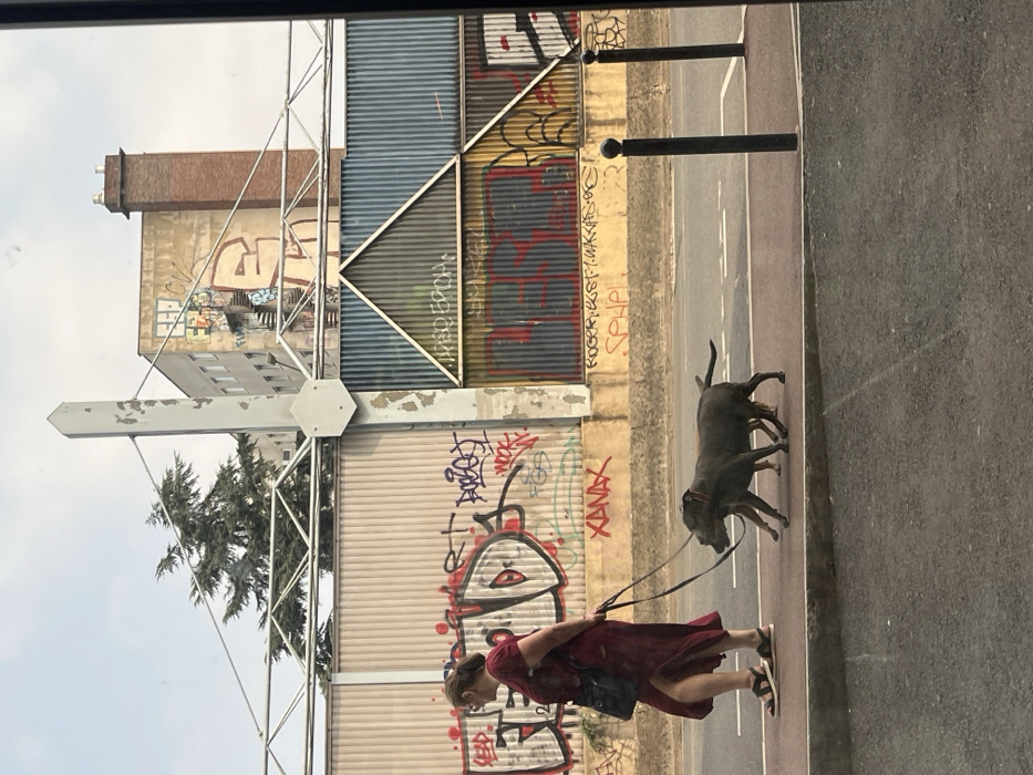 - "An outdoor daytime scene in Gentilly, France, depicts a woman walking two dogs on a leash on a sidewalk" by FM-NQrs03, licensed under CC BY 4.0