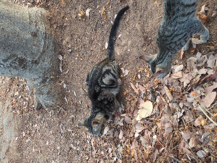 - "The scene captures two short-haired tabby cats on dry, leaf-strewn ground in Tiruvannamalai, India" by FM-M0G9X2, licensed under CC BY 4.0