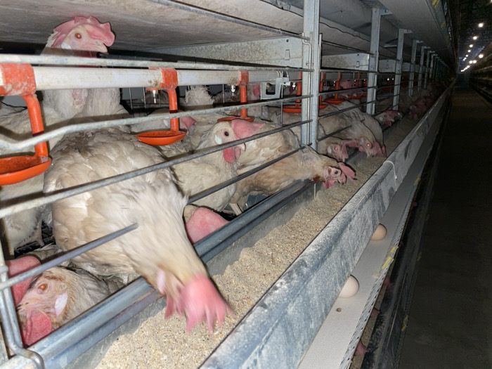 - "An interior view of an industrial poultry farm, located in Shuyene Vosta, Afghanistan, displays multiple tiers of metal cages housing numerous white laying hens" by FM-LYje72, licensed under CC BY 4.0