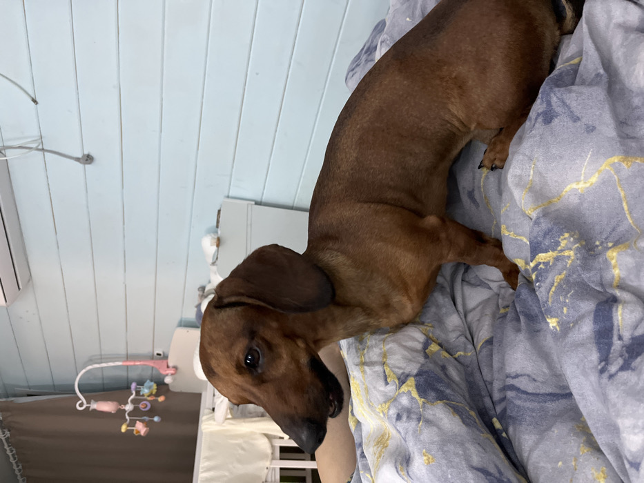 An interior scene in Razdol'e, Russia, depicts a reddish-brown, short-haired Dachshund dog positioned centrally on a bed, facing left