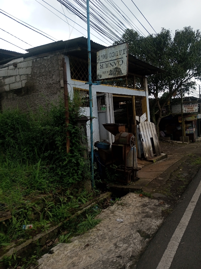 The image depicts an overcast street scene in Sandamal Eliya, Sri Lanka, featuring a single-story commercial building on the left. The building has a corrugated metal roof, with its left wall constructed from concrete blocks and partially covered in rough plaster and dense green vegetation. A light-colored frame surrounds the building's open front entrance, behind which a lattice security grate is visible. Above this entrance, a weathered rectangular sign hangs vertically, displaying inverted text that reads "CIANJUR" at the top and "TAUCO NO. 1" at the bottom. A blue utility pole stands directly in front of the building, supporting a dense network of overhead electrical or communication wires that crisscross the grey sky. On the concrete pathway in front of the building's entrance, a rusty, dark-colored industrial machine, possibly a mill or grinder, with a hopper and a large flywheel, is positioned. Several light-colored wooden panels lean against the right side of the building's entrance area. The immediate foreground features a concrete sidewalk or pathway, bordered on its left by a narrow concrete drainage ditch containing some water and overgrown with grass and weeds. To the right of the pathway, an asphalt road with a single white lane marking is visible. In the background, further down the road, another building with a corrugated roof and partially legible signage is visible, alongside a large, leafy tree. No individuals or animals are present in the scene.