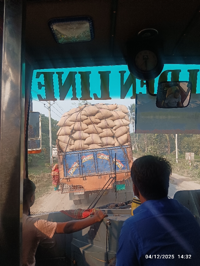 The image depicts a daytime scene viewed from the interior of a vehicle, likely a bus, on a rural or semi-rural road in Kaliganj, Bangladesh, dated 04/12/2025 at 14:32. In the immediate foreground, within the vehicle from which the photograph was taken, a partial view of the dashboard and steering wheel is visible. A male individual in a light-colored shirt is positioned to the left, with his hands on the steering wheel, indicating he is the driver. Another male individual, wearing a blue shirt, is seated to the right, observed from behind, facing forward. The vehicle's front windshield has a blue tint, reflecting the mirrored text "ENIL LINE" at the top. An overhead light fixture and a small clock are mounted on the ceiling. A rearview mirror hangs to the right, reflecting the face of a person, likely a passenger or the blue-shirted individual. Directly ahead, in the midground, an overloaded, rust-colored truck with a blue cargo bed is traveling on an unpaved or dusty road, moving in the same direction as the viewing vehicle. The truck's cargo bed is heavily stacked with numerous large, light-brown burlap sacks, secured with ropes, creating a significantly tall load. The rear of the truck displays yellow Bengali script and decorative patterns on the tailgate. Dust plumes are visible around the truck's wheels, consistent with movement on a dry, unpaved surface. To the immediate left of the overloaded truck, near the edge of the road, a person wearing a patterned red and green garment stands observing the scene. The road surface appears uneven and unpaved, transitioning into light vegetation and sparse trees lining the roadside in the background. The sky is clear and bright.