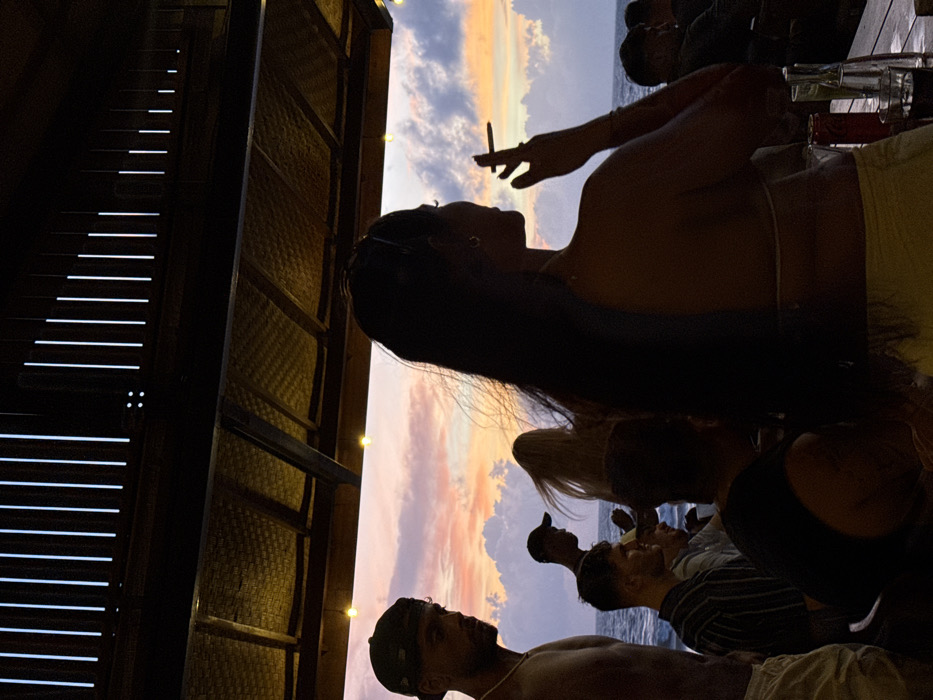 The image depicts an outdoor social gathering at a beachfront establishment in Canggu, Indonesia, during sunset