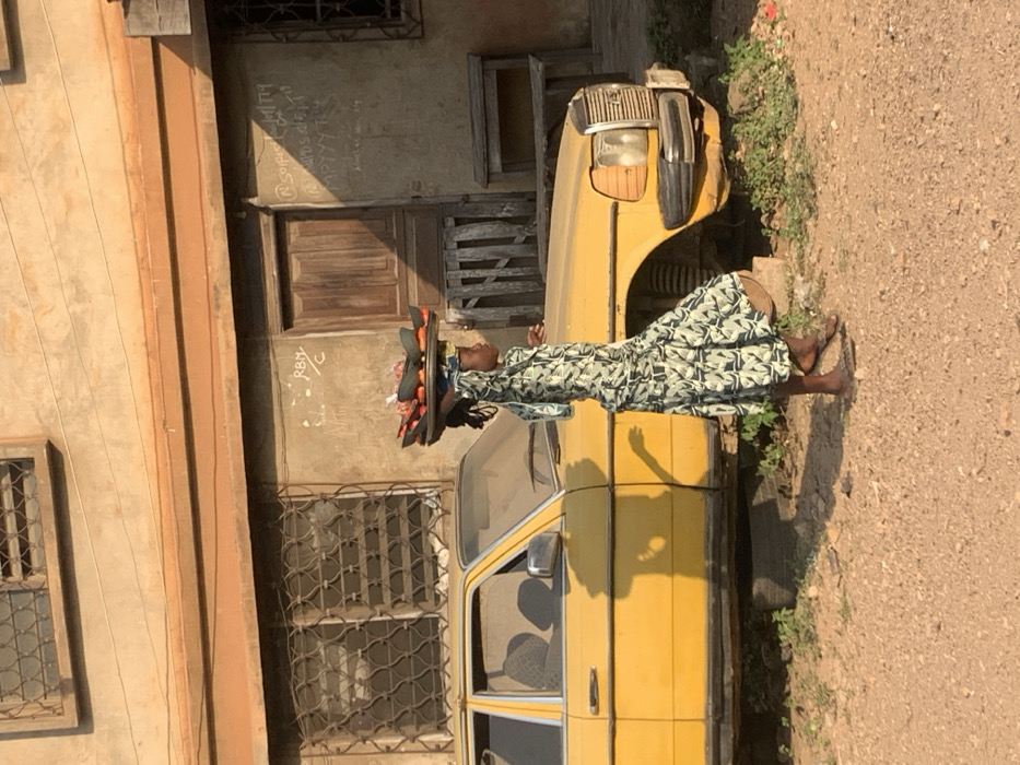 A woman wearing a patterned dress balances a tray of red objects on her head, standing beside a vintage yellow car. The vehicle is parked next to a building with barred windows and faded writing on the wall. The setting appears to be a dusty, somewhat dilapidated area. Sunlight casts shadows on the car and the ground nearby.