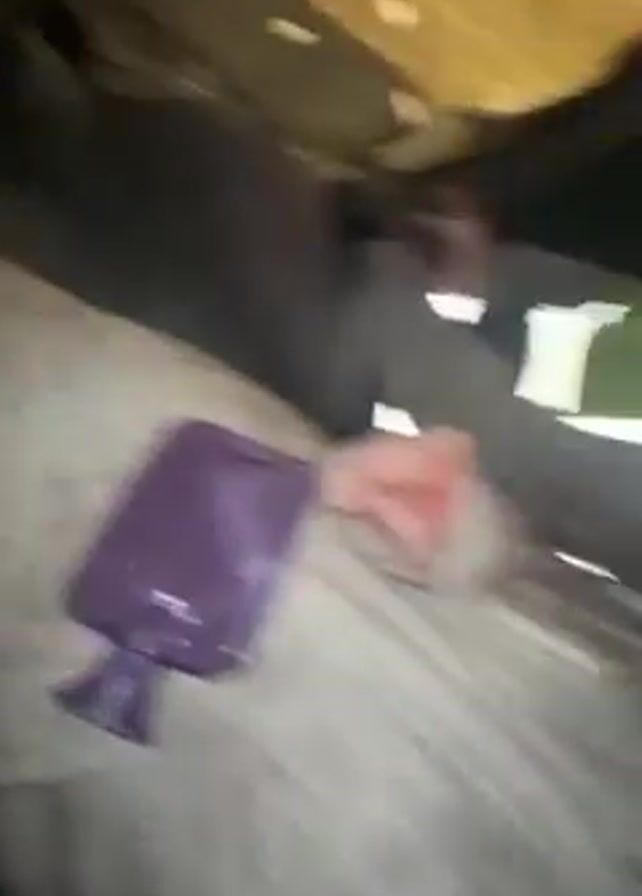 two people lying on a surface. Both have blood around their faces. One person is wearing a white jumpsuit covered in blood, and the other is wearing a green and yellow safety vest. The environment appears to be an industrial setting, with metal structures visible above. A purple object is near the person in the jumpsuit.