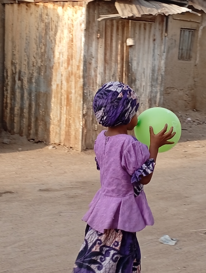 A young individual, viewed from the back and slightly to the left, is positioned on an unpaved dirt surface in Gwagwarwa, Nigeria. The individual wears a patterned purple and white headwrap, a light purple peplum-style top with cuffed sleeves, and a long, dark skirt featuring purple and black patterns. A vibrant green balloon, faintly displaying white script, is held in the individual's right hand. The background consists of a weathered, rusty corrugated metal wall on the left, and a light brown mud or adobe structure with a corrugated metal roof on the right. This structure features a small window opening and a door-like entrance, above which a white scoop is suspended. The scene is illuminated by natural daylight.